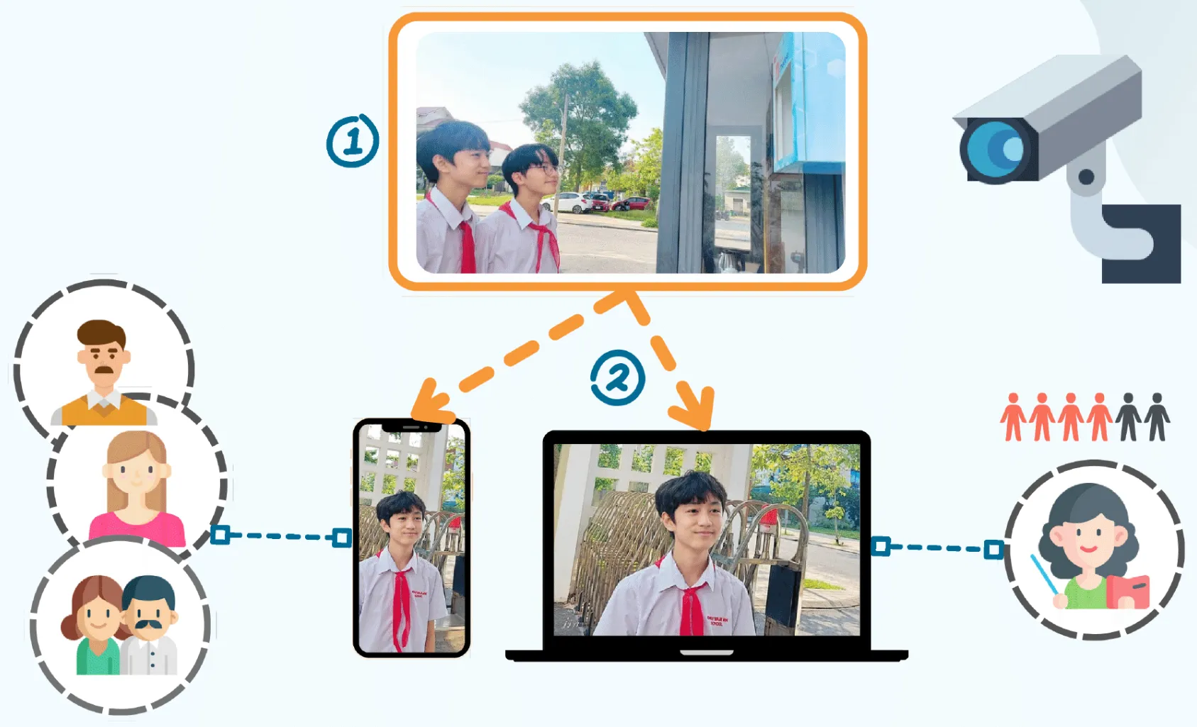 Hệ thống nhận diện khuôn mặt giúp việc điểm danh thông minh diễn ra nhanh chóng và tự động, cập nhật chính xác thời gian vào/ra của từng học sinh. Đồng thời, thông tin đến trường hay tan học của học sinh cũng sẽ được gửi thẳng đến các bậc phụ huynh để gia đình dễ dàng nắm bắt, phối hợp quản lý cùng nhà trường.